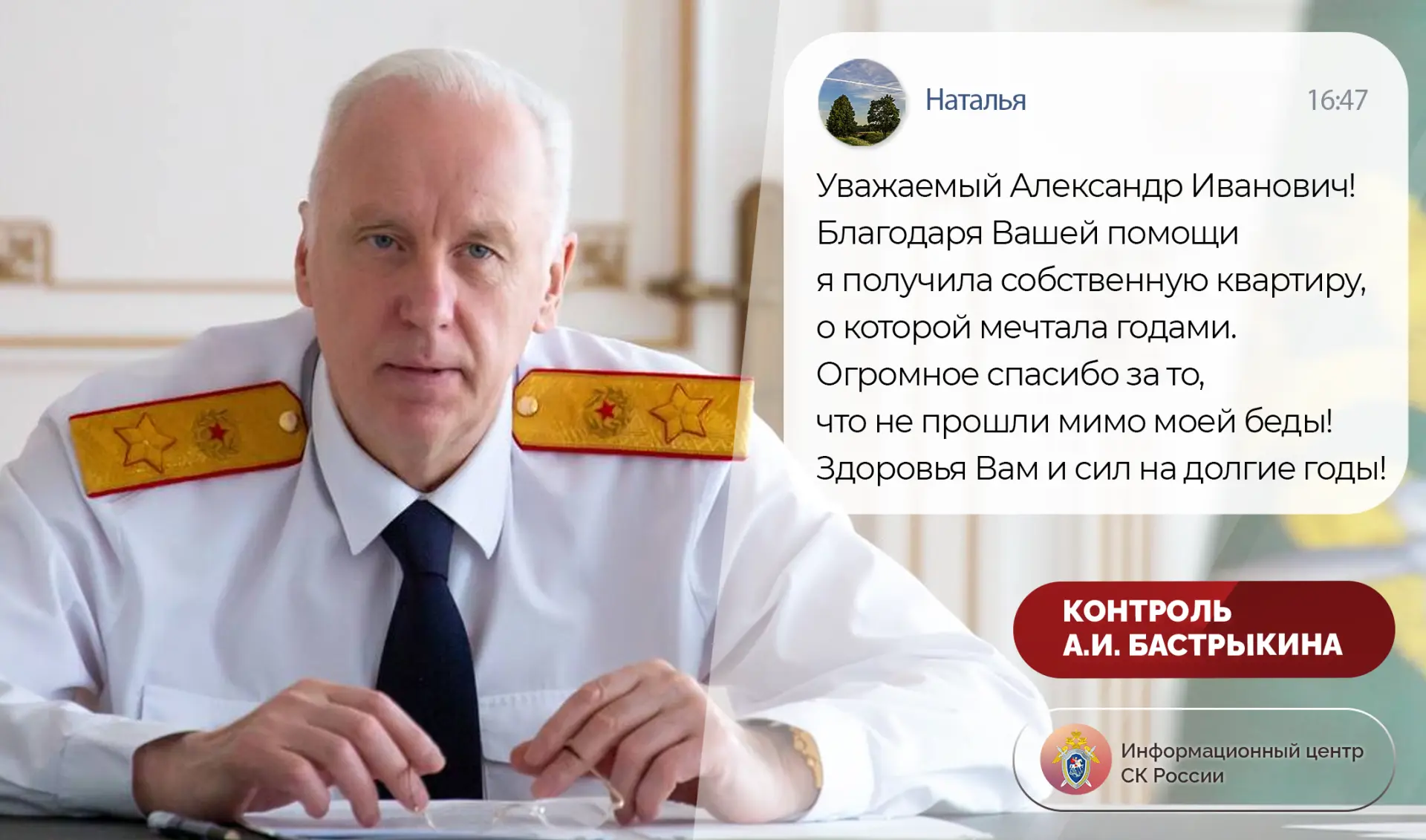 «Уважаемый Александр Иванович! Благодаря Вашей помощи я получила собственную квартиру, о которой мечтала годами. Огромное спасибо за то, что не прошли мимо моей беды! Здоровья Вам и сил на долгие годы!»