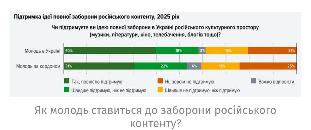 Согласно опросу, 21% молодых украинцев 14–35 лет теперь против запрета российского культурного продукта. Два года назад таких было всего 8%. Полная поддержка запрета российских книг, фильмов, музыки и СМИ упала до 40% (в 2024 году — 49%).