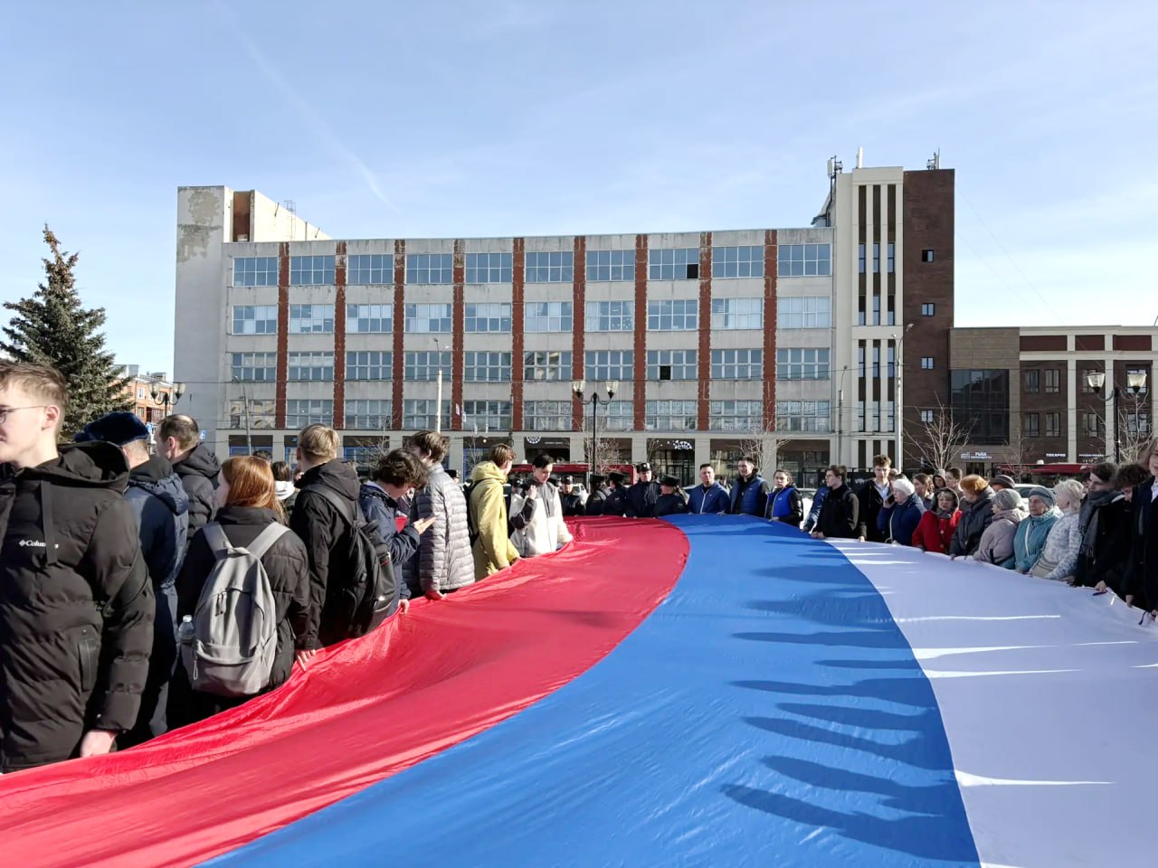 Центральным событием стал автопробег по улицам областного центра: колонна автомобилей с российскими триколорами проследовала от ТЦ«Аксон» до Площади Победы, где участники развернули 37-метровый флаг России.