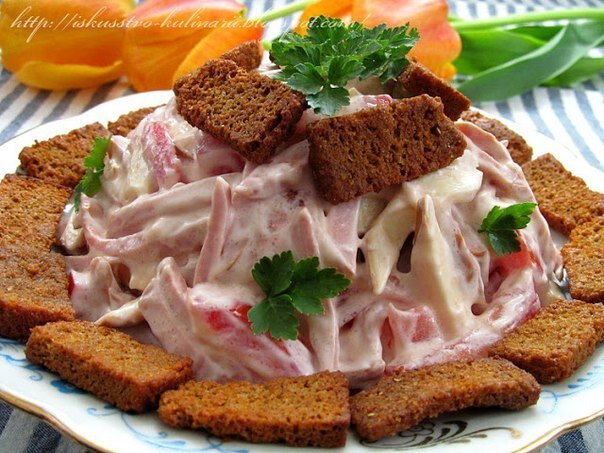 Далее, нужно аккуратно выложить все ингредиенты в салатник. Добавьте пропущенный через пресс чеснок, затем заправьте все майонезом, солью и перцем по вкусу. В конце добавьте сухарики и осторожно перемешайте, чтобы они не размякли. Подавать салат лучше сразу для сохранения его хрустящей текстуры!