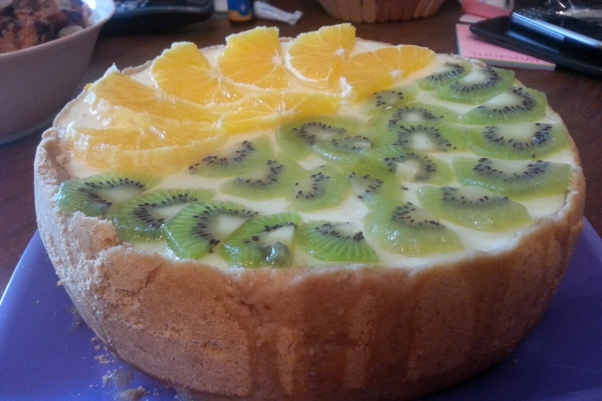 Сначала измельчите печенье с помощью мясорубки. Смешайте его с растопленным сливочным маслом и какао до получения однородной массы.Получившуюся смесь выложите на дно мультикассы с небольшими бортиками и уберите в холодильник для застывания.В другой миске наберите сметану и взбейте её с сахаром и яйцами. Постепенно добавляйте крахмал и ванилин, а затем творог. Поставьте на высокий оборот, чтобы получить пышную и однородную массу без комочков.Доставайте мультикассу из холодильника, тщательно протерите её до суха, и установите на нагревательный элемент.Залейте творожную массу и выпекайте чизкейк в режиме «Выпечка» в течение 60 минут.После завершения программы дайте чизкейку полностью остыть, прежде чем нарезать его. Украсьте каждую порцию дольками апельсина и киви.Для последнего штриха развести желе в кастрюле с 250 мл воды и 2 столовыми ложками сахара, довести до кипения и аккуратно полить им чизкейк.