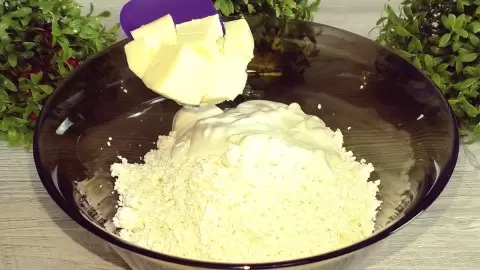 Первым делом берётся творог, предпочтительно 9% жирности. К нему добавляются 130 г сметаны 20% жирности и сливочное масло, вынутое из холодильника заранее, чтобы стать комнатной температуры. Вместо стандартного сахара лучше использовать варёную сгущёнку, но можно и обычный сахар или сахарную пудру для сладости.