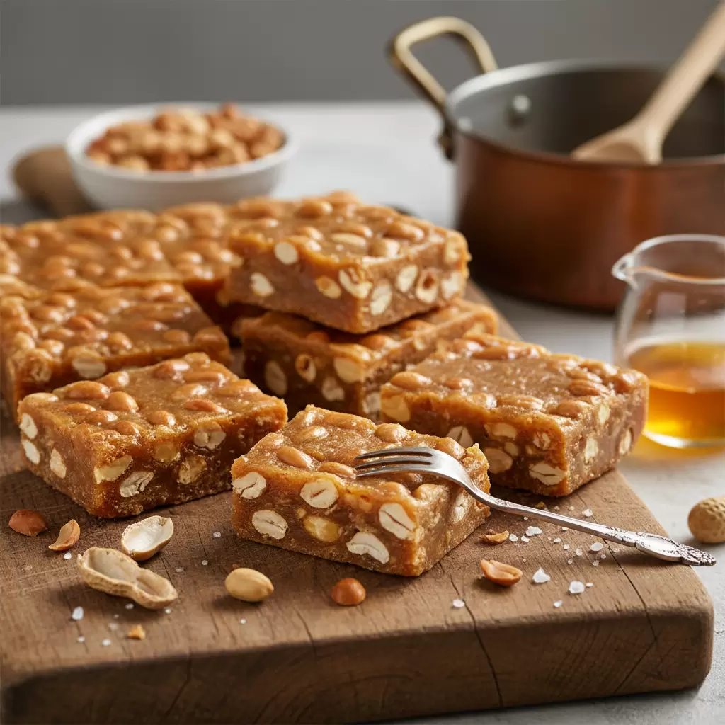 После того как смесь достигнет нужной консистенции, снять с плиты, добавить подготовленный арахис и быстро перемешать. Выложить массу в форму, застеленную пергаментом, и выровнять поверхность. Оставить застывать при комнатной температуре или в холодильнике на несколько часов. Подают щербет, нарезав его на кусочки.