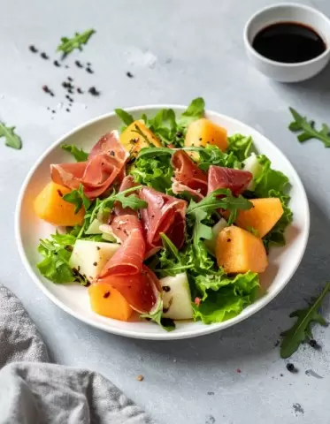 Приготовление: Хамон лучше заранее положить при комнатной температуре. Дыню нарезать, а листья салата выложить на тарелку. Затем добавить дыню и ломтики хамона, сбрызнуть оливковым маслом и, при желании, уксусом и перцем. Это сочетание смягчает соленость хамона и делает это блюдо более легким для повседневного стола.