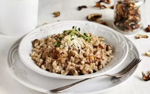 Этот вариант гречки — это итальянская интерпретация, напоминающая ризотто. Советуем обжарить крупу с ароматными ингредиентами, а затем постепенно добавлять бульон, чтобы добиться кремового эффекта.
