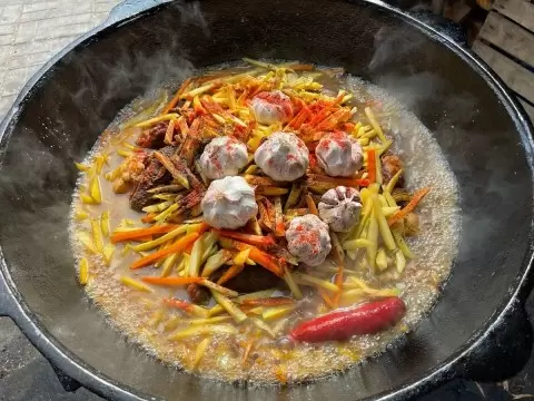 После этого важно правильно сложить ингредиенты в казане. Рис выкладывается на мясо ровным слоем, и ни в коем случае не перемешивается. Сделайте паровые отверстия ложкой, чтобы пар мог выходить, не разрушая структуру риса.