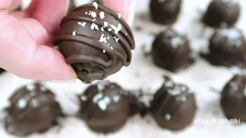 Обмакнув шарики в растопленный шоколад, дайте лишнему шоколаду стечь, а затем выложите конфеты на пергаментную бумагу. Для легкости можно использовать две вилки, чтобы избежать загрязнения рук. После этого отправьте конфеты снова в морозильник — на 10 минут.
