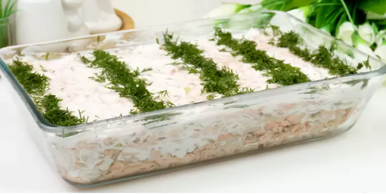 Когда рыба немного остынет, очистите ее от костей и разберите на волокна. Добавьте к рыбе соль и перец по вкусу и тщательно перемешайте. Теперь можно приступать к сборке салата. В глубокую посуду укладывайте поочередно слои: сначала рыбу, затем лук и немного майонеза. Повторяйте слои, пока все ингредиенты не закончатся, и обязательно завершите сверху слоем рыбы, смазанной майонезом.