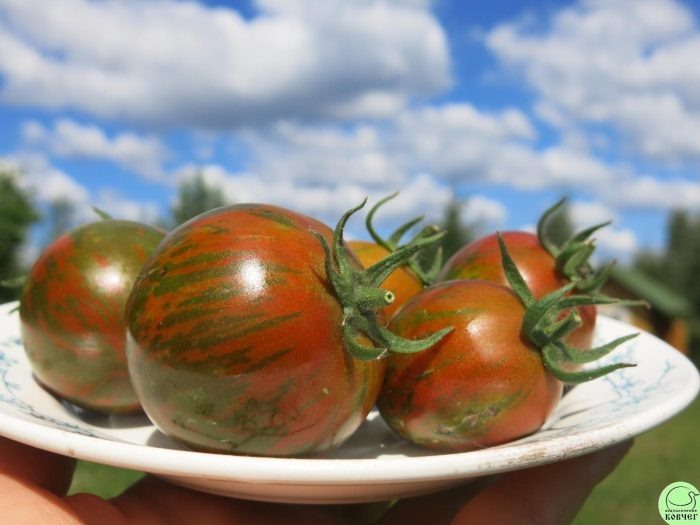 Плоды имеют уникальную окраску: шоколадно-красный фон с контрастными зелеными полосами, их массa достигает 80-150 граммов. Вкусовые качества выделяются благодаря сладкому привкусу с фруктовой кислой ноткой, что делает их подходящими для свежих салатов и консервирования. Плотная кожура обеспечивает хорошую транспортацию и сохранность во время хранения.